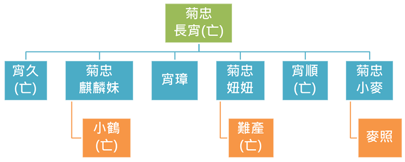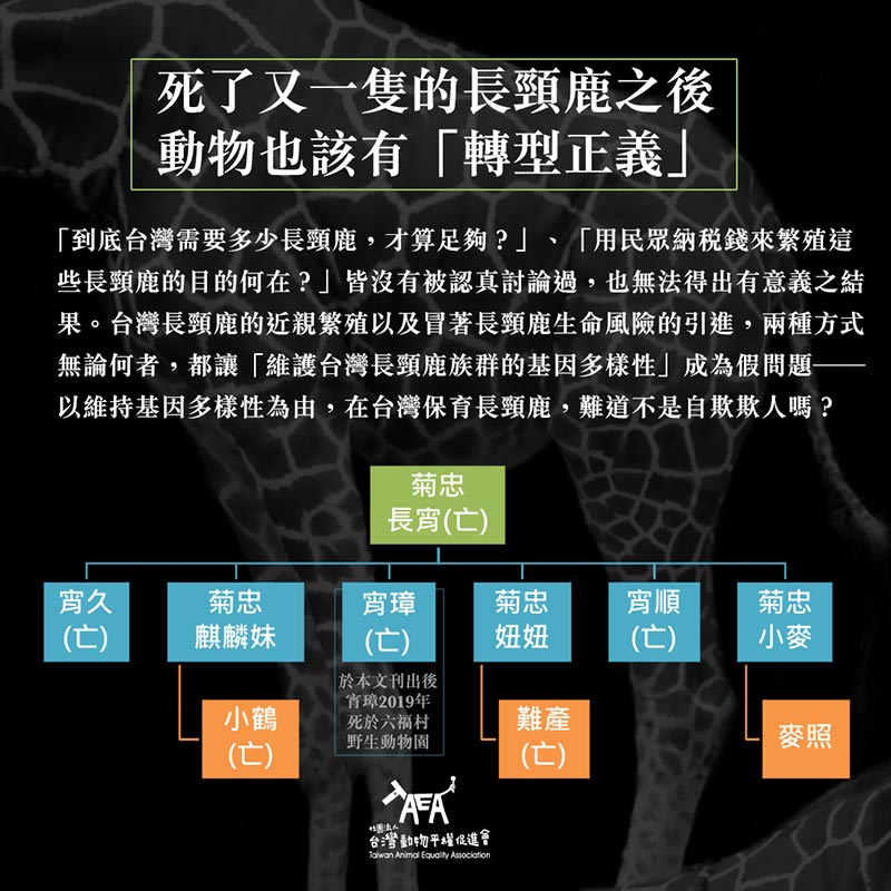 前述所謂的「借殖」,原本用意乃是「域外保育」為維持基因多樣性常用的手段,意即在不同的動物園之間,交換動物個體以避免近親繁殖。但根據事實,台北市立動物園的長頸鹿就不乏近親繁殖,園中現有的4頭長頸鹿,分別是「菊忠」、「麒麟妹」、「小麥」、「麥照」,近幾年的族譜及死亡如下圖所示。