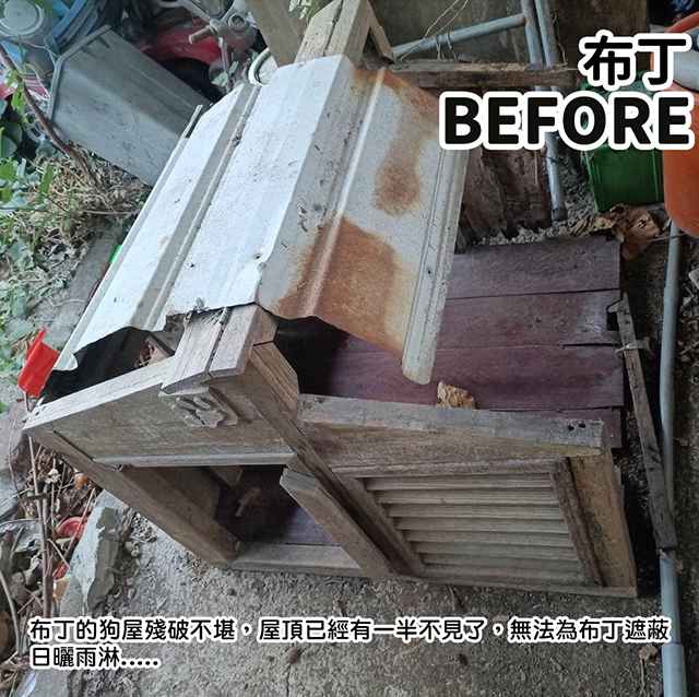 布丁(Before) 布丁的狗屋殘破不堪,屋頂已經有一半不見了,無法為布丁遮蔽日曬雨淋