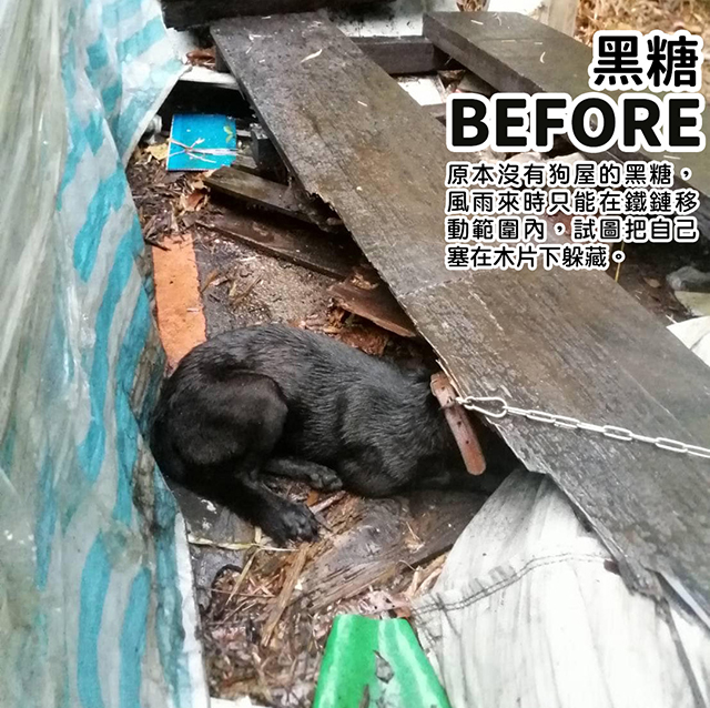 黑糖(Before) 原本沒有狗屋的黑糖,風雨來時只能在鐵鏈移動範圍內,試圖把自己塞在木片下躲藏