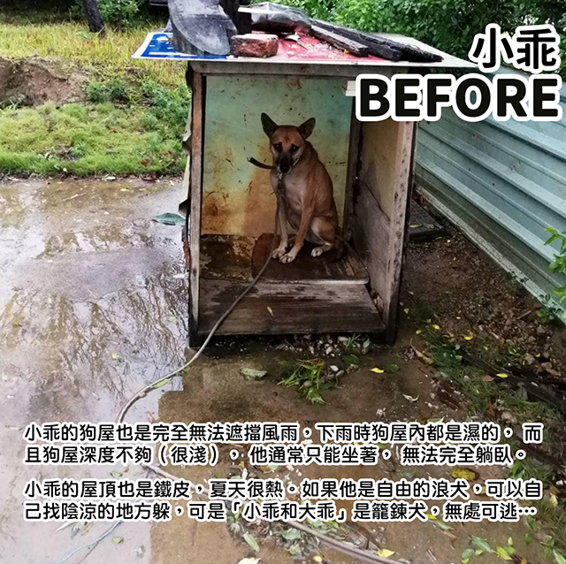 小乖(Before) 小乖的狗屋也是完全無法遮擋風雨, 下雨時狗屋內都是濕的, 而且狗屋深度不夠(很淺), 他通常只能坐著, 無法完全躺臥。 小乖的屋頂也是鐵皮,夏天很熱。 如果他是自由的浪犬, 可以自己找陰涼的地方躲, 可是「小乖和大乖」是籠鍊犬,無處可逃….