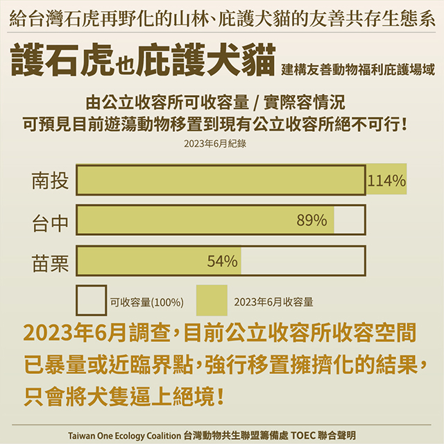 對於野保團體「移置犬隻應收容於管理良好之公立收容所」之建議,因無視現況、欠缺配套,我們必須指出其不可行並強烈反對!檢視目前三縣市公立收容所量能現況,絕對無法因應試辨專案。以農委會今年6月底最新統計顯示,南投縣公立收容所可留容犬隻最大值300隻,目前在養比已114%;台中市可留容犬隻800隻,目前已89%;苗栗縣可留容犬隻235隻,目前已54%,其他縣市收容所也類此嚴重空間不足,強行移置嚴重擁擠化的結果,只會將犬隻逼上絕境,預見移置到現有公立收容籠舍絕不可行!