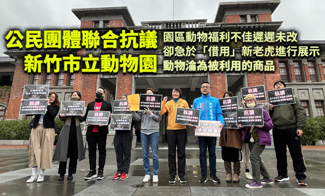 去年(112)十月,新竹市立動物園飼養的最後一隻老虎「六福」離世後,園方再次向六福村接洽借展老虎,並於上週(1/16)發布新聞表示新老虎已抵達園區。但其實六福還在世時,動團曾接獲多位民眾檢舉有關園區內的動物飼養問題,因此早在去年112年2月,台灣防止虐待動物協會 (TSPCA) 就協同了專家學者一同前往動物園進行現場勘查,提供了園方提升動物福利的相關建議,並也在高虹安市長日後舉辦的座談會中提出相同的訴求,獲得市府團隊的改善承諾。然而,時間過了將近一年,除了未見承諾被落實,動物繼續受苦,園方更是在短短的時間內為了滿足遊客,再次向私人企業引入新動物個體,而非積極改善園區現有的問題,根本漠視動物福利,更是與當初高虹安市長提出的動保政見不符。今日(1/23)公民團體代表與新竹市議員廖子齊、新竹縣議員朱建銘共同召開記者會,替動物園內的動物發聲抗議,呼籲終止不當的動物展演。