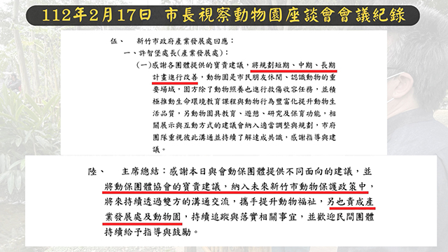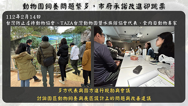 早在112年2月14日,動團就協同TAZA台灣動物園暨水族館協會代表、食肉目動物專家共同前往新竹市立動物園與園方會勘,討論園區內超過20個不同物種的動物飼養與展區設計問題及改善建議。更在同年2月17日受邀參加新竹市長視察動物園座談會,提出園方應擬定短中長期改善計畫等訴求,會議中市府團隊也承諾將廣納各團體建議,納入未來動物保護政策,並責成產業發展處及動物園,持續追蹤與落實相關事宜。TSPCA執行長姜怡如表示:「過去一年期間,動團因為擔心動物狀況,也曾向動物園園長聯繫,想了解園方的改善進度以及建議是否適用,但未得到任何回應。今年1月8日於電話中,產業處副處長僅表示的確對於動物園「督導不周」,會再找TAZA到場給予指導,但此說法不符邏輯,因為在一年前專家學者就已經提出具體的問題與建議,市府的動保政見似乎淪為公關說法,令人遺憾。」