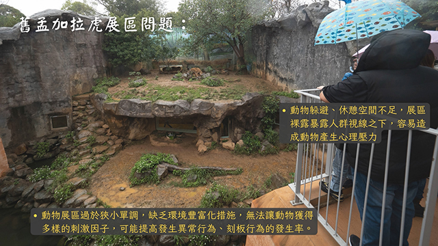 一、當時孟加拉虎已出現刻板行為(異常行為),代表動物精神上已經出了問題,園方應盡全力增加環境豐富化。