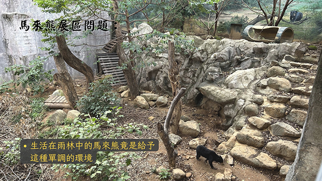 一、在馬來熊身上觀察到與孟加拉虎同樣的刻板行為,是一個動物福利低落的指標之一,馬來熊長期飼養於環境貧瘠、單調的展區,無法滿足馬來熊的習性需求。
