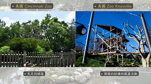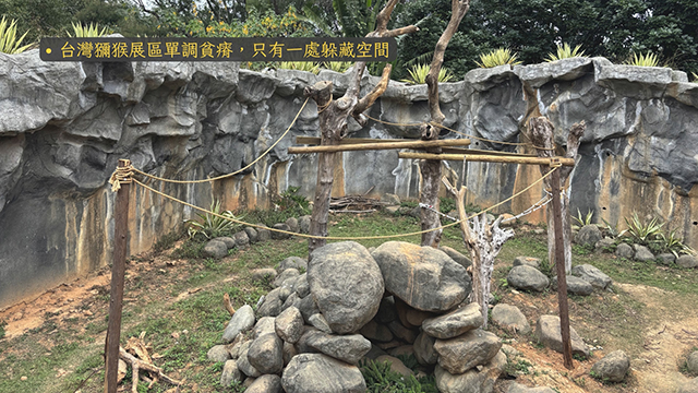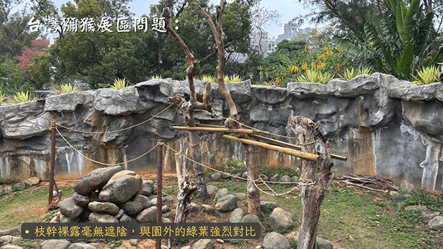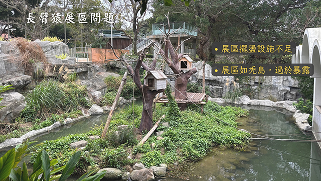 二、長臂猿是棲於樹冠層的動物,展區擺盪設施不足,無法讓動物充分展現物種特性,且展區如禿島,過於暴露,導致天候不佳時動物受限於小屋中,動物可使用的空間其實非常有限。