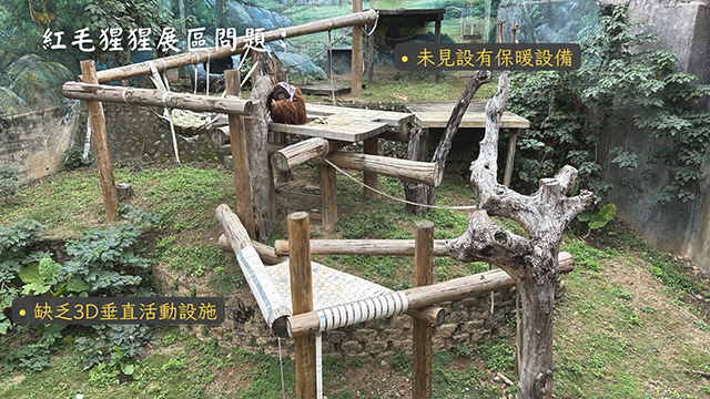 三、紅毛猩猩與長臂猿同為樹棲動物,展區內缺乏足夠的3D垂直活動設施;園方甚至沒有提供生長於熱帶的物種保暖設備,可想像新竹冬日的冷風對紅毛猩猩來說並不好受。展區內的遮蔽與躲藏空間不足,也缺乏讓紅毛猩猩可以選擇築巢的自然樹枝。專家也指出,此個體行為呆滯、過度inactive,應積極增加多項豐富化措施,改善異常行為。
