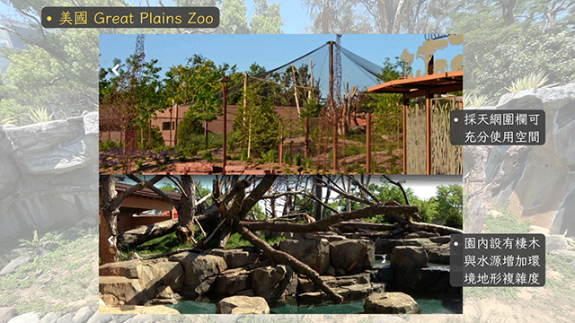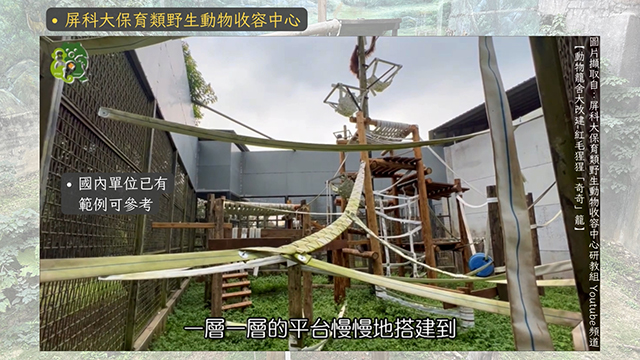 二、動物展區空間過於狹小、單調,但展區空間既已成形修建不易,除了增加環境豐富化措施,可重新進行後場廊道之規劃,與隔壁也已經出現刻板行為的馬來熊或紅毛猩猩不定時交換展區,讓動物獲得多樣的刺激因子,減少異常行為、刻板行為的發生。