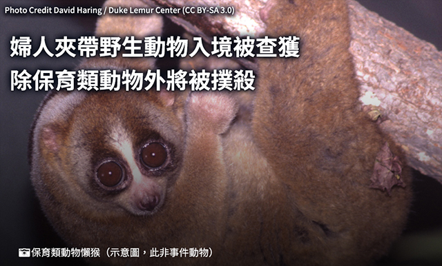 根據媒體報導,一名64歲婦人從泰國入境時,身上綁有87隻活體動物被查獲---其中包括一級保育類動物懶猴,其他則有普通狨、嬰猴、斑頭貓頭鷹、綠鬣蜥、尼羅巨蜥、印度星龜、馬來食蝸龜及黃頭陸龜等10種;這名婦人過去就曾經就有夾帶活體動物的紀錄 ,因此被列為海關關注對象。