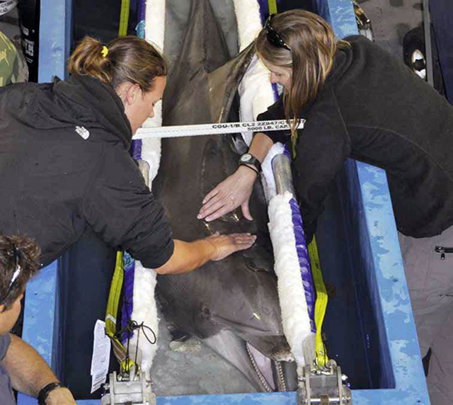 美國海軍在加州和夏威夷州二處基地有軍用海豚設施,搭運輸機往返時,艙內除了有熟悉的人類夥伴,也有功調和照明,而且海豚用擔架支撐在水池內,持續保濕和減低腹部壓力。
