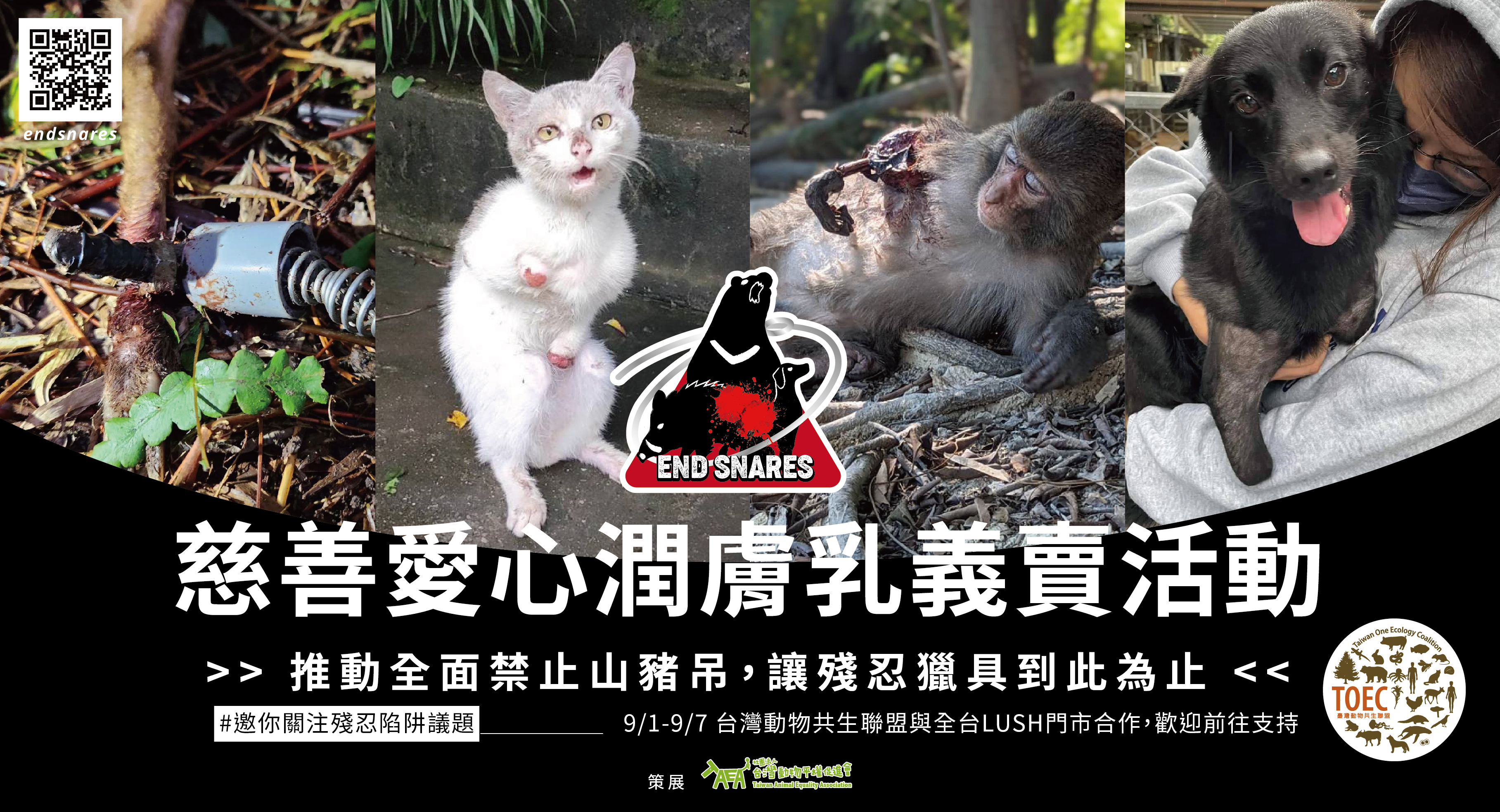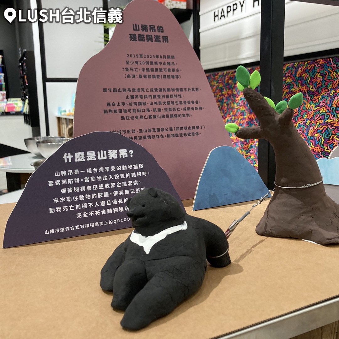 美妝保養品牌LUSH將與「臺灣動物共生聯盟」合作發起「終結套索陷阱」小型展覽,自9/1起在店舖展出,盼民眾了解山豬吊陷阱對野生動物造成的嚴重傷害。