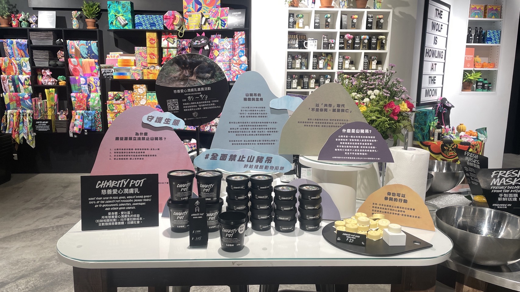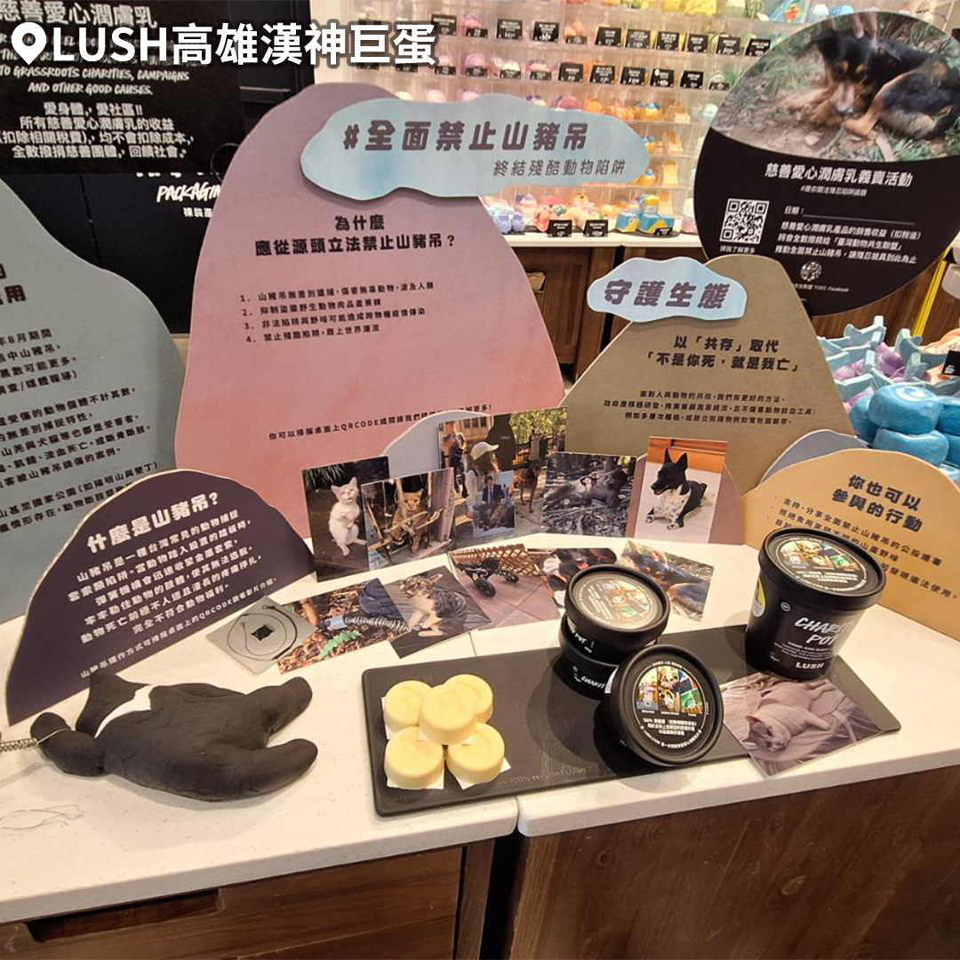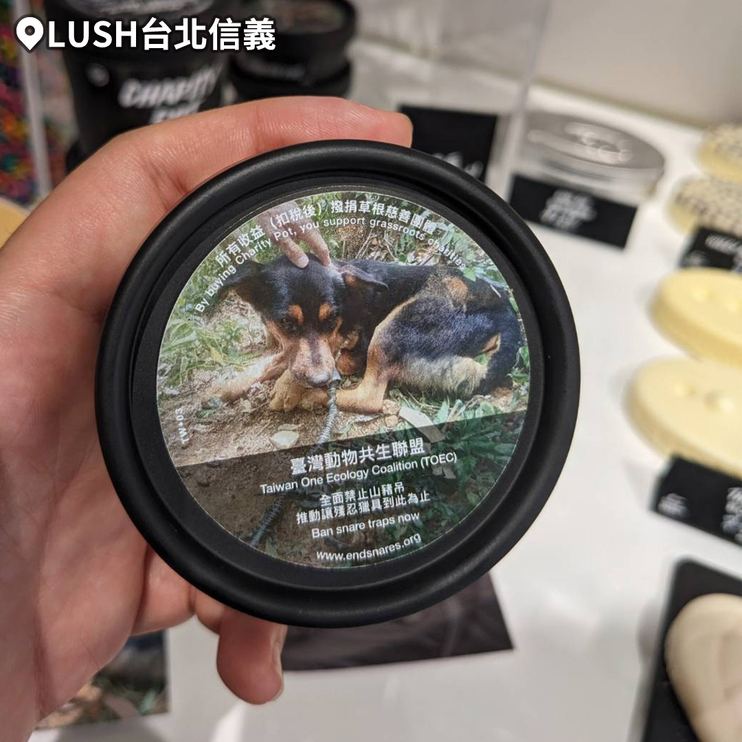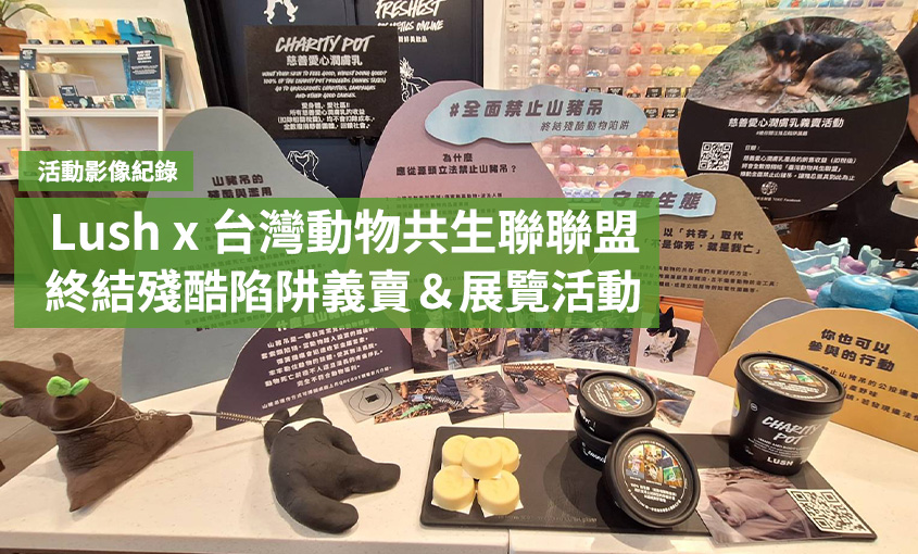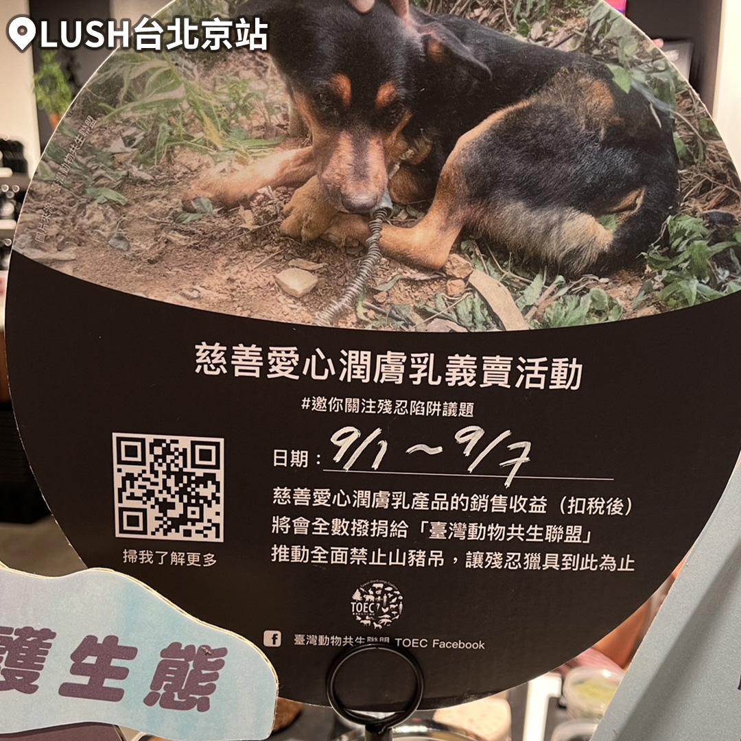 除了9月在店內進行議題展覽,LUSH還配合「慈善愛心潤膚乳義賣」活動,該款產品的銷售收益、扣稅後將會全部捐予台灣動物共生聯盟。