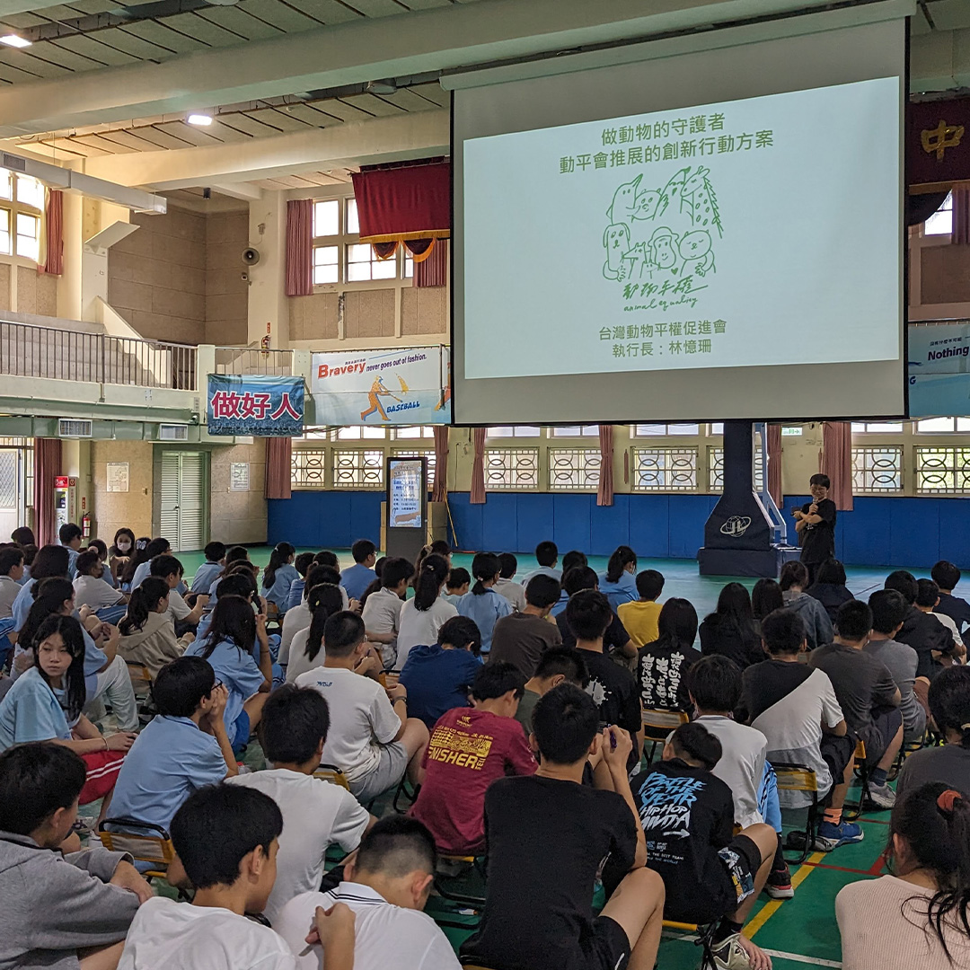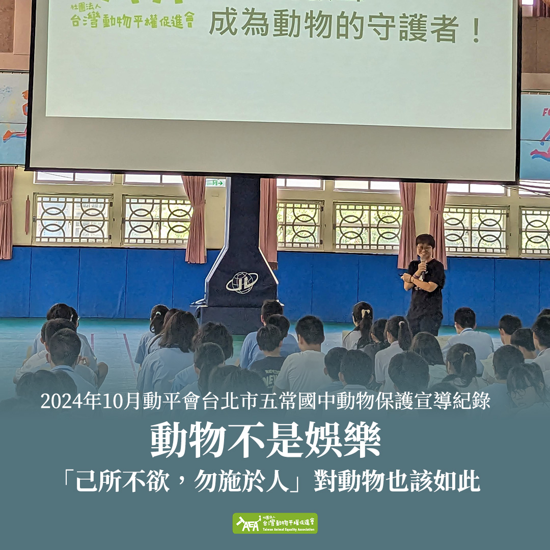 10月25日,動平會前往台北市五常國中進行動物保護宣導,主題為「喜歡牠,也尊重牠:動物不是娛樂」。宣導活動中透過豐富的影像紀錄,引導學生共同探討動物展演的相關議題。例如,以圈養可愛動物為噱頭的互動體驗活動,雖冠以「教育」之名,卻缺乏深度與設計,最終僅淪為滿足遊客好奇心的表演。短短幾分鐘的參觀,卻換來動物終身的囚禁,令人深思。