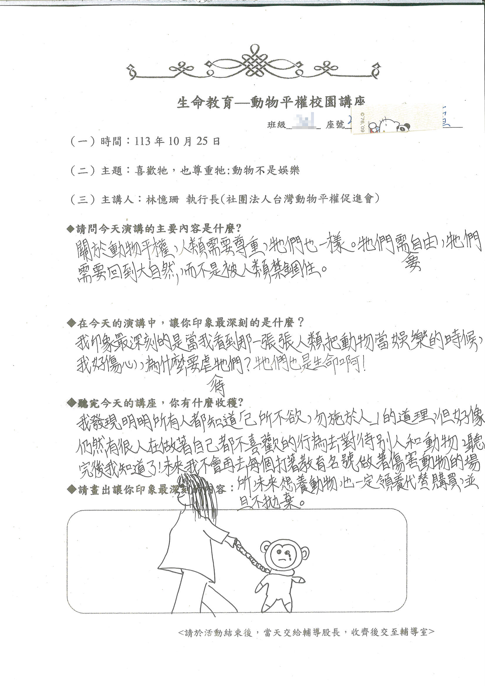 引此有同學在講座後的回饋單寫到:「己所不欲,勿施於人」的道理不僅適用於人類之間,也應該延伸到對動物的態度上。