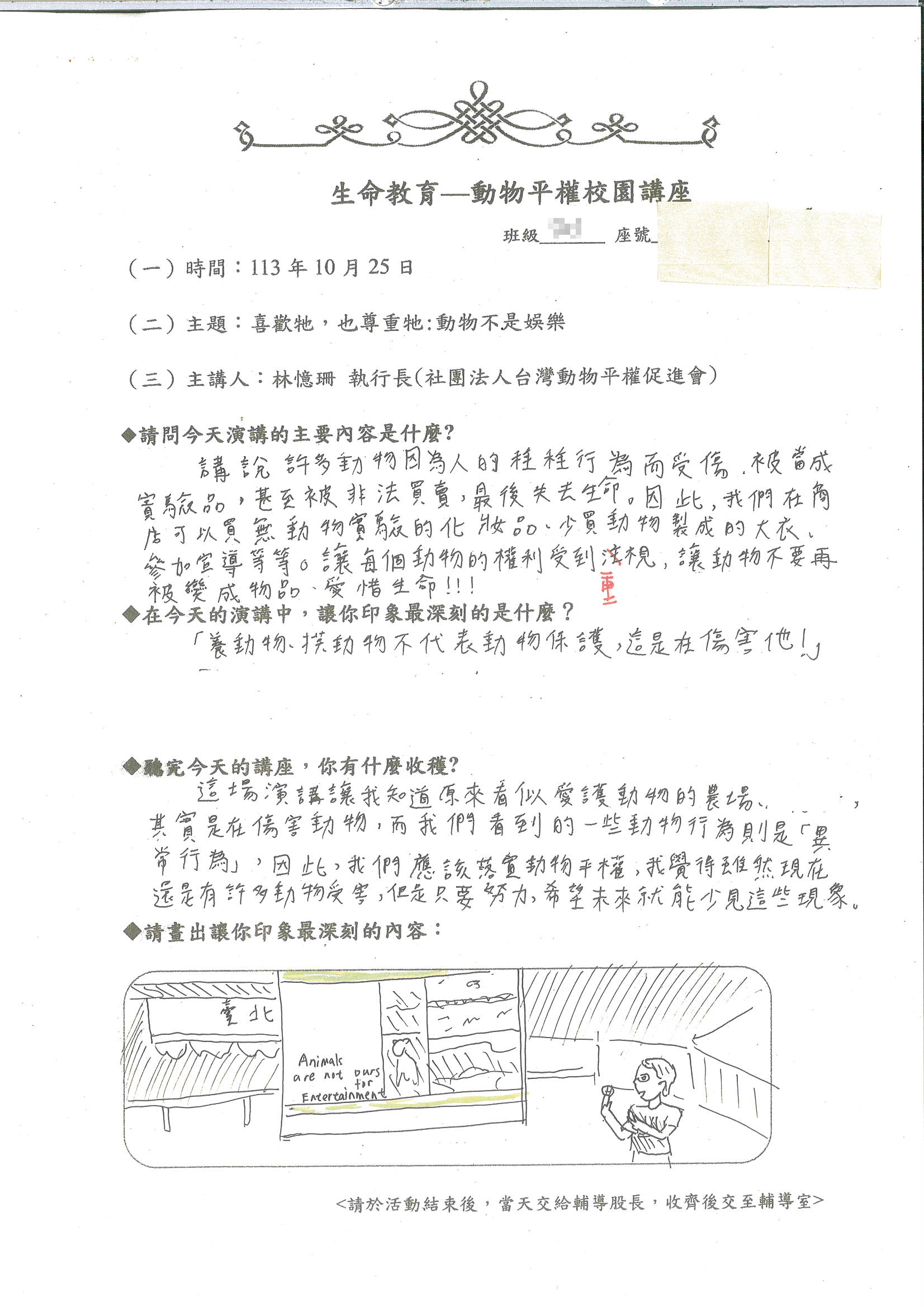 另一位同學更進一步反思:「養動物、摸動物不代表動物保護,這是在傷害牠!」這句話一針見血地點出了一個關鍵問題——許多表面上的友善,其實只是人類需求的投射,而非對動物真正的尊重。當我們將動物視為玩具或娛樂工具,滿足自己的欲望時,這樣的行為已經與真正的保護背道而馳。