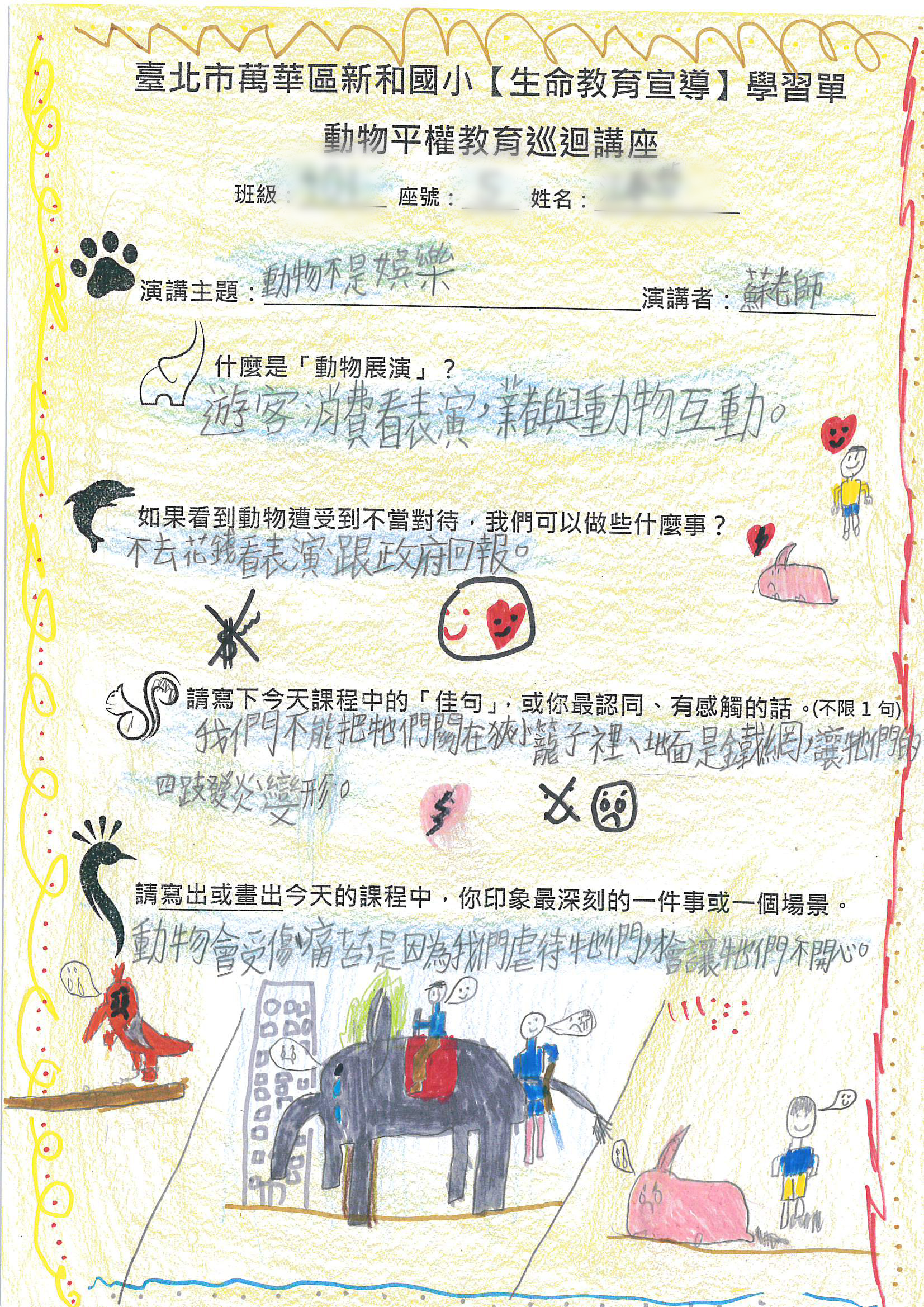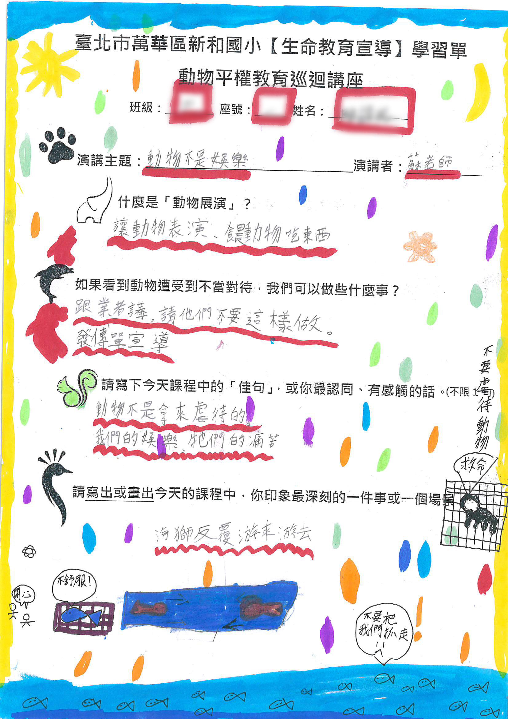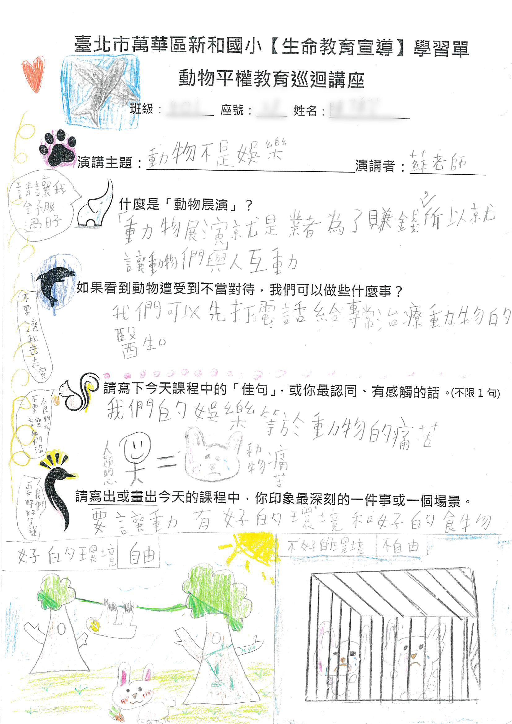 從同學的回饋可以看出,他們在這堂課中對動物被迫表演的情境有了深刻的認識和反思。例如,幾位同學寫道:「我們不能把動物關在狹小的籠子裡」,並且畫出被困在籠子裡的動物,像是海獅和兔子,牠們眼神流露出悲傷。他們的畫作反映了動物因不自然的表演而受到的痛苦,讓人深刻感受到動物在被迫進行表演時的無助與壓力。