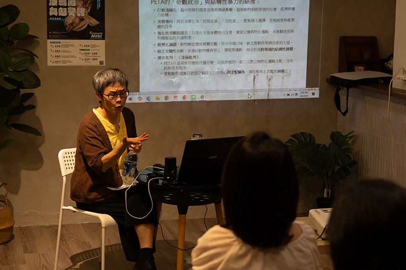 更誇張的是,類似的挪用也出現在動物保護運動裡。有些知名團體,例如 PETA,長期使用性化女性身體的方式呼籲關注動物受苦,強烈依賴視覺衝擊,試圖以「吸睛」換取「愛心」。然而,這種做法不但重複了父權文化的凝視模式,也把行動侷限在情緒性的個案宣傳。真正支撐動物剝削的龐大結構,例如產業鏈、勞動、政策與資本關係,反而被忽略。張嘉如直言,PETA只是更新了符號,卻仍使用同一套舊有的物化邏輯,因此無法跳脫框架,最終也難以推動深層變革。