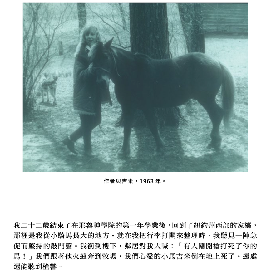 Carol Adams原本對動物與素食並沒有強烈的想法。但是她在 22 歲那年,念耶魯的神學院,完成了大學的那個第一年的學業回家,有人來敲門告訴她,她熟悉的一匹小馬被射殺了。晚餐時她要吃漢堡,忽然意識到自己吃的是另一個「死去的生命」。就是這種突然的轉折的時刻(「大馬士革時刻(Damascus moment)」),好像忽然間你的觀念,就進入了另外一個世界。我自己在研究人與自然世界、人與動物與植物關係的過程中,也彷彿打開了一扇紙窗。原本,我只是抱著一個很小的念頭——想替我的貓、替一些動物寫故事,後來轉向真正「看見動物」,這種視角轉變也是動物史研究的重要關鍵。這也是李鑑慧老師一直強調的,最近她也會去談歷史學裡面到底有沒有「看見動物」這樣的一個主題。