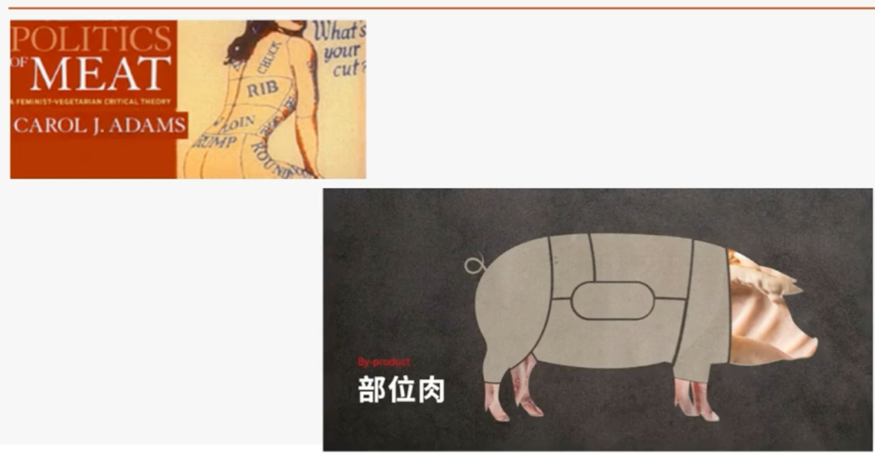 在這裡(上圖),我們可以看到兩張圖。左上這張是 Adams 書裡的例子,把女性的身體標成像肉品切割部位一樣。右下角則是我在網路上找到的肉品廣告,它把豬的身體切成不同部位,標示出每一塊肉的位置。這兩張圖有一個共同點:不論是女性的身體,或是一隻豬的身體,都被分割、標示、命名,好像在告訴我們哪一部分比較好、比較值得拿來吃。尤其右邊那張圖,你會發現它完全是用肉(meat)的角度去看,而不是把這隻豬當作一個生命來看。整體呈現的方式,就是直接把身體當作可用、可切割的部位去思考。