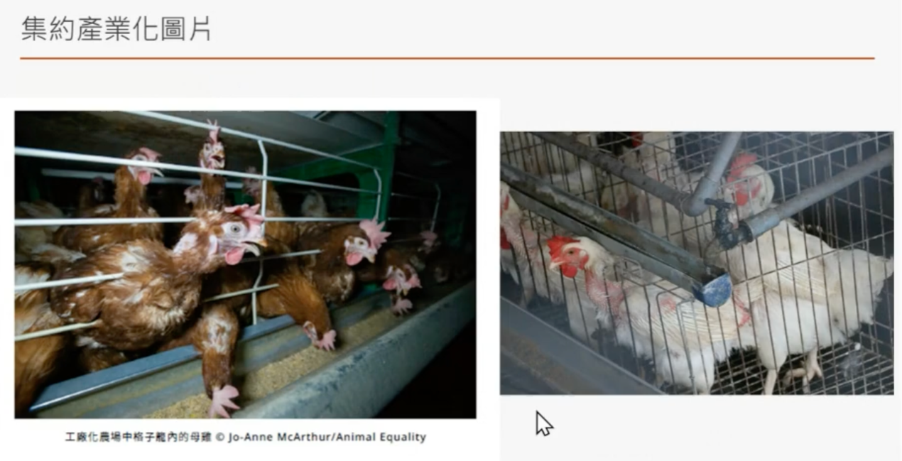 (上圖)左邊是書裡的照片,右邊這張圖是台灣雞場的照片。可以看到,不管是國外還是台灣,籠飼雞因為必須把頭伸出籠子吃飼料,身體長期摩擦,羽毛、脖子上的毛會掉落,甚至出現皮膚的創傷。你就會看到牠們的身體發生很悲慘的變化。但在養殖體系裡,只要牠們能長大、能被宰殺、能進入市場,好像就可以了。