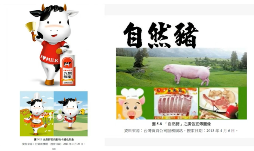 在養豬的廣告裡,我們常看到「自然豬」這種畫面:豬走在草原、山景很美,給人一種很天然、很健康的感覺,好像我們吃的豬都是在這樣的環境長大的,跟安全、安心連結在一起。像光泉牛奶的動物形象也是這樣,牛看起來非常開心、健康、活潑。這種廣告裡面,性別的部分比較沒有特別強調。可是在「幼豬寶」飼料廣告裡,就出現豬媽媽開心使用人類飼料去餵養小豬的想像。
