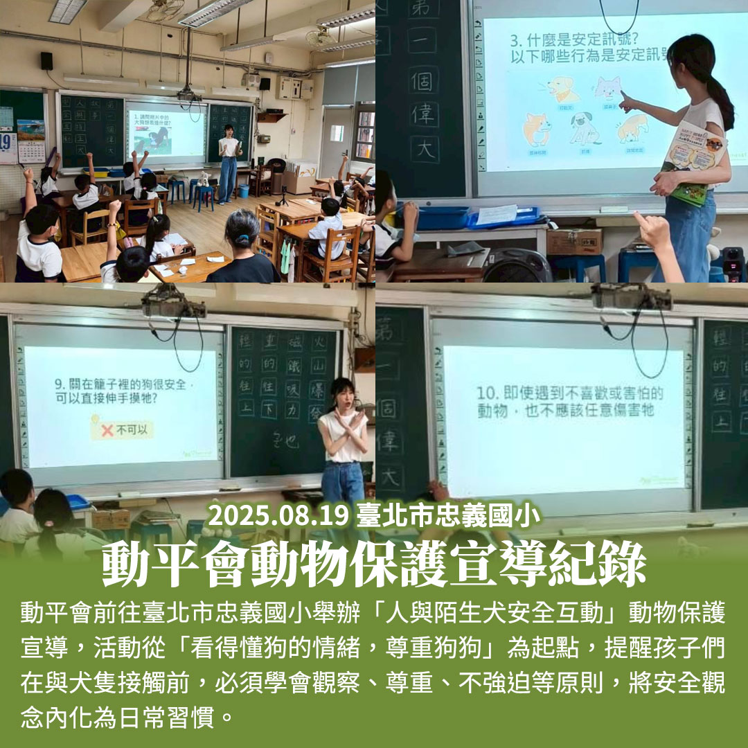動平會於8月19日前往臺北市忠義國小舉辦「人與陌生犬安全互動」動物保護宣導活動,透過情境示範與互動問答,引導學童認識犬隻行為、了解安定訊號與互動的安全守則。活動從「看得懂狗的情緒,尊重狗狗」為起點,提醒孩子們在與犬隻接觸前,必須學會觀察、尊重、不強迫等原則,將安全觀念內化為日常習慣。