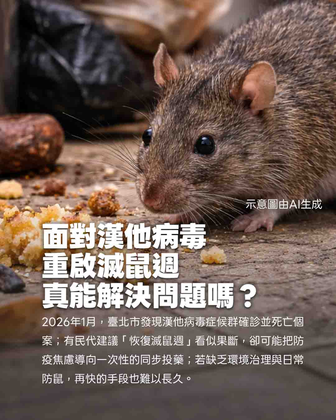 因此,相較於押注短期、同步、集中投藥,更務實的方向是:把資源挪回日常、可持續的環境治理與衛生管理,並將「防鼠三不」提升到與登革熱「清除孳生源」同等量級的社會共識與政策推力。