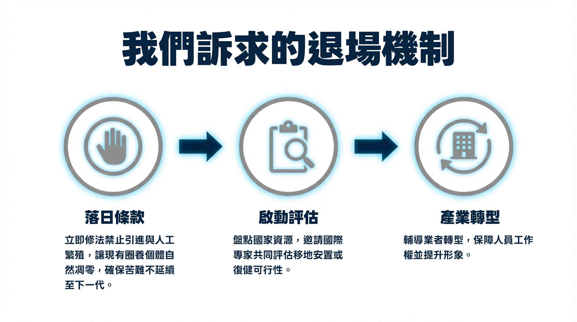 制定落日條款:修法即刻禁止引進與人工繁殖新個體,讓圈養個體自然凋零,確保沒有下一代繼續受苦。