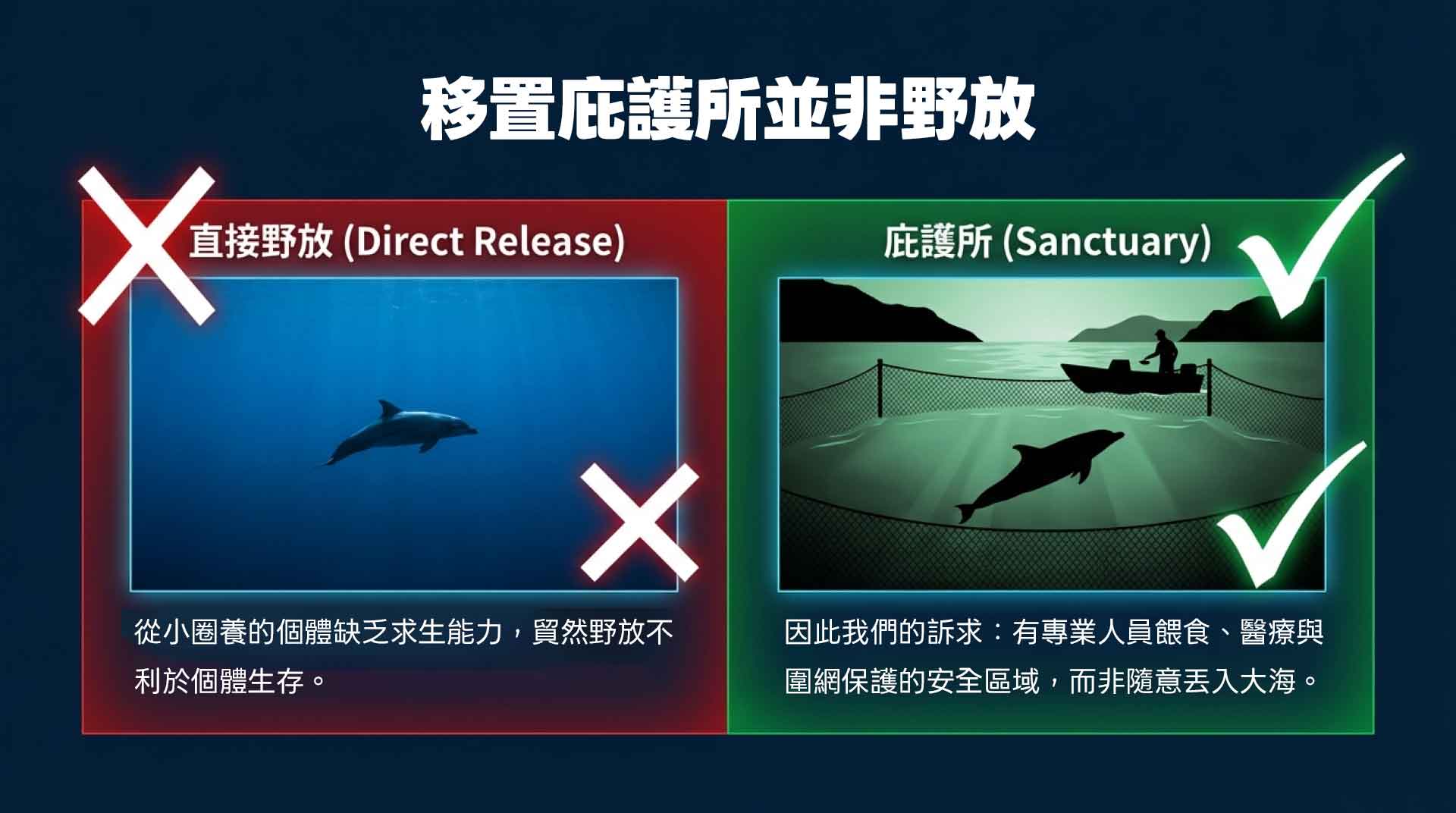 這份連署的目的,從來不是天真地以為明天就能變出一座完美的庇護所,而是要逼迫政府把這些困難的問題搬上檯面,制定明確的鯨豚展演落日條款與退場轉型機制!