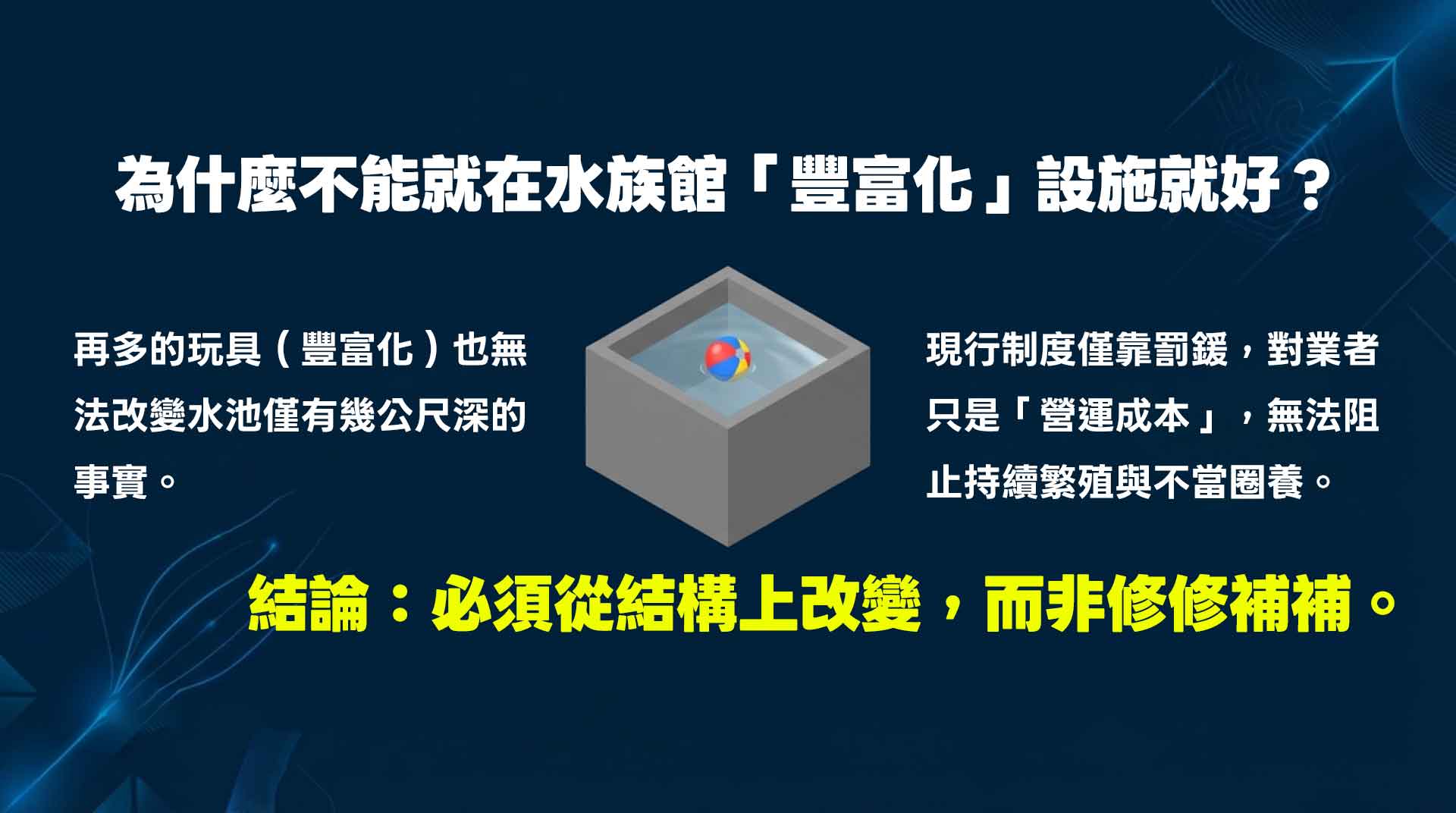 既然地點、資金、技術都這麼困難,為什麼還要發起連署?難道照網友說的,留在水族館裡要求業者增加行為豐富化不就好了嗎?因為所謂的豐富化,終究改變不了表演池只有幾公尺深的事實,更無法滿足牠們一天本該游行上百公里的天性。我們不能因為解題很難,就選擇假裝看不見,用改善環境來自我安慰。