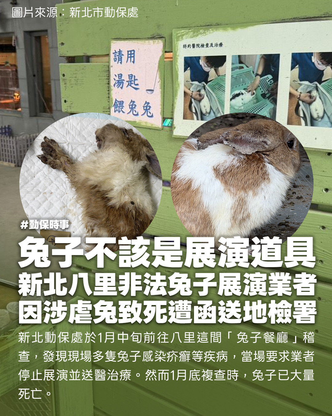 新北動保處於1月中旬前往稽查,發現現場多隻兔子感染疥癬等疾病,當場要求業者停止展演並送醫治療。然而1月底複查時,兔子已大量死亡。