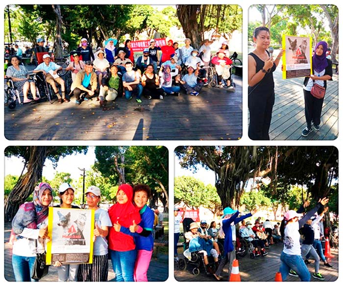 活動回饋:利用長輩和看護工一起外出散步的悠閒午后,我們安排了勁歌熱舞的活動,也宣導移工在台應注意的法令,其中也包括動保法。台灣的雇主相當認同這樣的活動,因為移工跨境來台會遇到文化和法律的差異,用印尼語來進行宣導絕對是必要的。(感謝台灣勞工權益關懷協會協助宣傳)