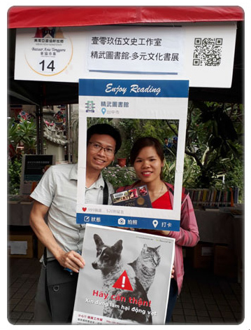 活動回饋:此活動為「壹零玖伍文史工作室」與「精武圖書館」聯合主辦之東南亞書展,由於本月書展時間為周六,普遍移工周日才放假,因此現場民眾較少。本活動藉由曝光市立圖書館內的東南亞館藏資源,向在場借閱書籍之移工進行交流,現場越南印尼籍主持人為了讓移工加深了解台灣動物保護法,也有用母語向移工宣導台灣的法律,提高移工保護動物的意識,以保障自身的工作權。(感謝協助宣導:壹零玖伍文史工作室)
