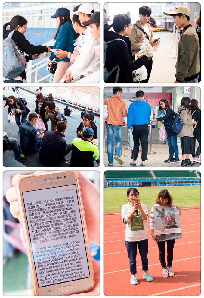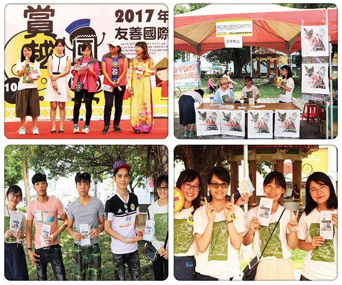 活動回饋:藉由桃園市政府勞動局舉辦的〈2017桃園盃VIPT 東南亞足球聯賽〉,動平會的志工們又一次前往桃園體育館,向移工觀衆們宣導台灣動保法。雖然有些移工早就知道在台灣不能虐待、宰殺狗貓,並很認真的執行這條規定,但也有不少移工懷疑的問我們說:「哦,是哦?我第一次聽到,罰款那麽多錢?還可能被遣送回國?法律有那麽嚴格嗎?……」。這時候,我們都很耐心跟他們講解,讓他們更加了解台灣的動保法,能夠入鄉隨俗。同時我們心裡也覺得很高興,因為又多了一個人瞭解這條規定,也意味著又減少了狗貓被虐待的危機。