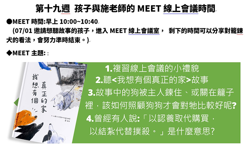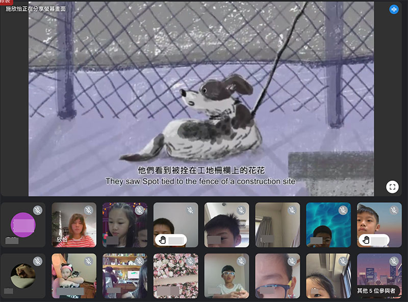 孩子們透過YOUTUBE觀看<我想有個真正的家>動畫,再一起線上討論繪本最後的提問:小黑、小黃、花花和小白(恰巧就是台灣流浪狗最常見的一黑、二黃、三花、四白(四種花色)四隻狗狗,為什麼會在那裏?牠們能自由活動嗎?牠們的飲食狀況如何? 雖然孩子不太懂得何謂「動物利用」,但能感受到「因為長得沒有寵物犬可愛,太會叫,所以要關籠子,好可憐。」、「狗幫人們顧果園、工廠、蓋房子的地方,但是卻得不到好的照顧,好像不太對。」有的孩子還說:「狗好像賣火柴的小女孩,死掉了也沒有人知道。」線上課程的時間很快就要結束,有的孩子們主動在螢幕前分享了自己幫動物之家狗狗畫的新的背景,畫面看起來溫馨和諧。希望孩子們童稚的願望能成真,就像繪本中的狗狗想像的:「真正的家是什麼樣子的呢?」願台灣每一隻被人所豢養的同伴動物,都能住在能活出牠們本性的幸福之處。