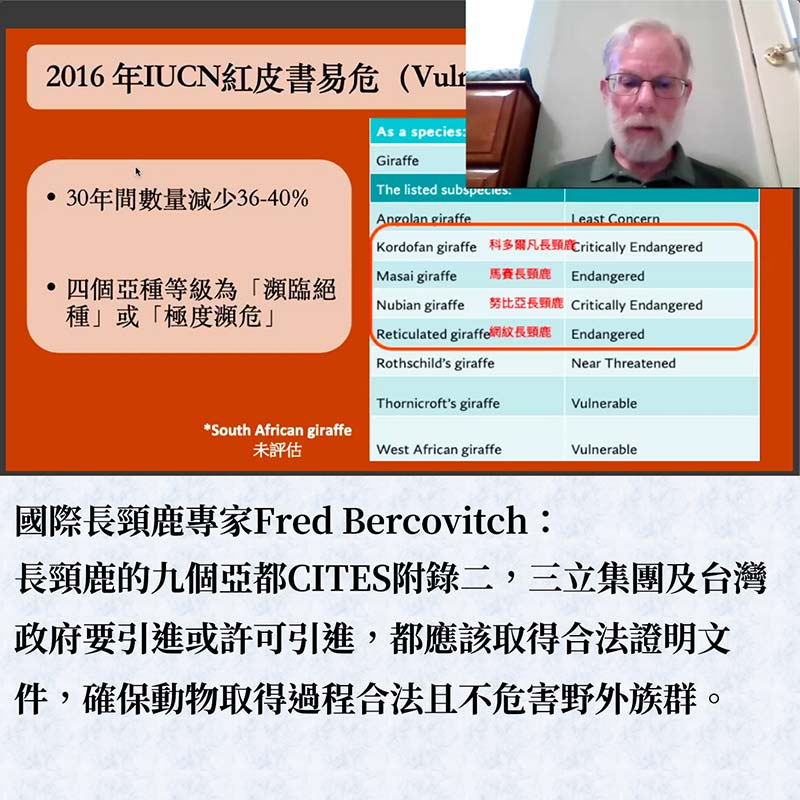 IUCN長頸鹿評估報告的共同作者,並擁有超過20年於非洲國家研究長頸鹿資歷的野生動物保育生物學家Fred Bercovitch表示:網紋長頸鹿是原生在東北非酷熱、乾旱氣候的亞種。台灣從史瓦帝尼這個沒有任何原生長頸鹿,卻為了營利而販售長頸鹿的國家,進口瀕臨絕種的網紋長頸鹿,不僅對物種保育造成危害,更是相當惡劣且麻木不仁的行為,必須遭受譴責。他並進一步提問:
