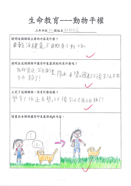 當初在思考「生命教育~動物保護」的相關講座時,希望課程內容除了要貼近三年級孩子的生活經驗,更讓孩子有加深加廣的學習。也很幸運的,看到「台灣動物平權促進會」網站上針對動物平權有許多的影片和介紹,協會也利用繪本教學、圖畫、講座、體驗等多元方式,讓學生了解動物平權的意義。