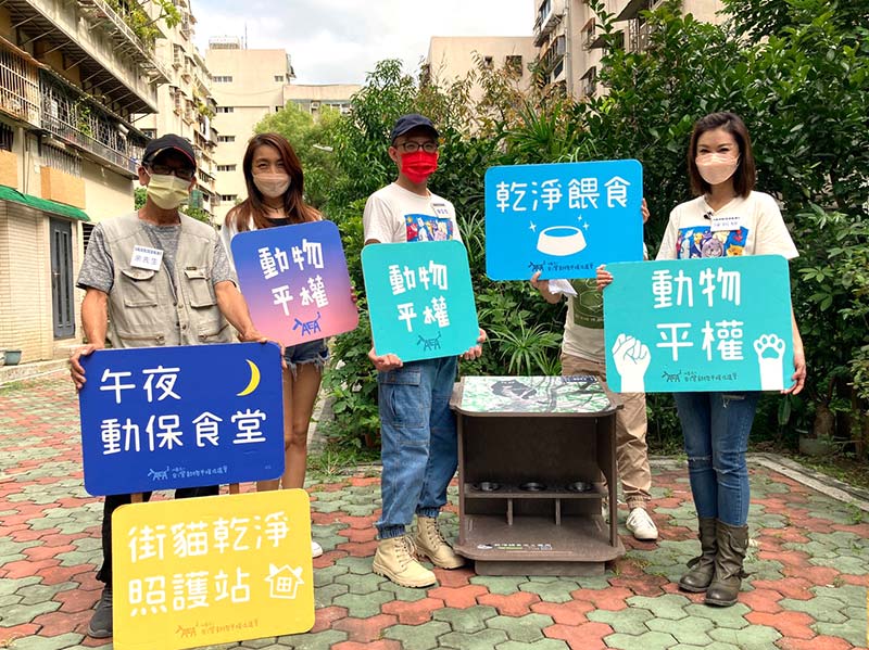 「午夜動保食堂:街貓乾淨照護站」,於臺北市鄰里擺置至少45座貓屋照護站,供區域民眾照護街貓,落實乾淨餵食觀念,打造人貓共諧的動物友善城市。每座照護小站皆備有遮雨區、貓砂盆、消毒清潔液及動物保護宣導文宣,由在地志工群共同維護,定點餵食,定時清潔,期待提倡多年的「乾淨餵食」守則可以落實,同時降低因餵食髒亂而產生的鄰里衝突,為街貓做好公關。