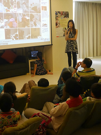 接下來的互動式教學,由理事長林憶珊分享"動物不是娛樂"的主題,不僅孩子感受動物的痛苦,也讓參與的家長深刻了解到農場動物在遊客的逗弄之下,看似可愛的乞食行為,原來都是都是長期以來不人道的對待與惡劣飼養環境之下所展現出不正常的行為。李爸爸說,除了向孩子說明,以往假日到農場看到的動物,因為農場主人缺乏對待動物的尊重與憐憫,加上被飼養在不屬於他們原本生長的環境,這些可愛的小豬小羊,甚至雜耍表演的小猴子,在帶給我們娛樂的背後,生活過的是如此辛苦,所以我們都要學著養成正確對待動物的態度。對待家裡的寵物也是一樣的道理。飼養寵物不能只為一時興起,需考量的不僅是家裡環境,自己的經濟狀況,更重要的是那份愛護他、照顧它們一輩子的責任感。除了教育孩子,李爸爸也感嘆這些看似寓教於樂的動物農場,只是商家藉由犧牲動物福祉來賺飽自己的荷包,更體認到以往假日帶著孩子到農場遊玩,實非一個好的教育管道。