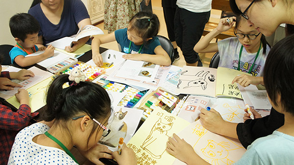 念完故事,小朋友更發揮創意,拿起畫筆,為動物們作畫,家長們也一起參與,親子同樂。這些作品紀錄了上課的過程,以及孩子們對動物的感受,還有送養貓咪的宣傳圖文,希望為動物盡一份心力。