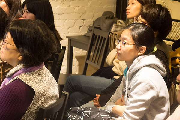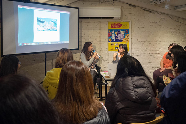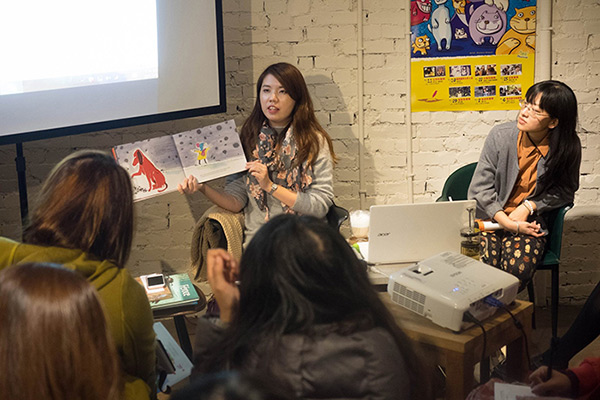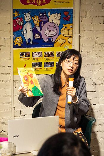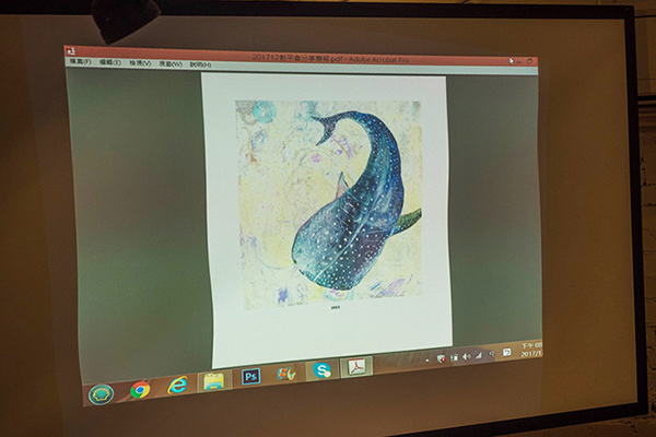 討論繪本後,貓魚分享創作歷程,她語調犀利的描述從國中腦袋就轉得和一般孩子不一樣的自己,大學時開始想和動物有關的事情,先是加入台大懷生社,再開始以畫畫、設計來協助動保需求。她分享了一個因為被豢養在海生館鯨鯊野放卻無法於大海生存死亡的故事,貓魚被這個傷心的事給擊倒了,因此畫了一張畫,期望心中的鯨魚可到其他地方好好生活。