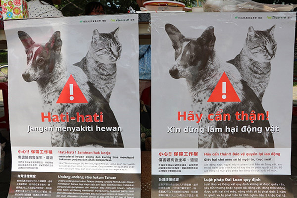 有些外籍移工對台灣法令不了解,仍延續在家鄉的飲食習慣,會宰殺或食用貓狗肉。透過宣導活動,他們知道這在台灣是違法的,會有高額罰款,還可能被遣送回國。台灣動物平權促進會製作了影片,還有四國語言文宣,邀請越南籍學生擔任解說員,與移工朋友面對面說明。