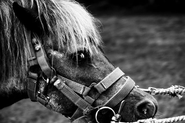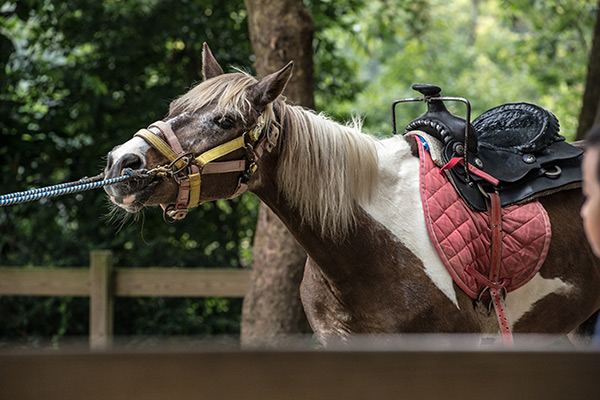 圖為動平會【2013動物不是娛樂】田野調查中,看到馬兒被業者強拉著勞役,不斷供遊客騎乘,牠一臉驚恐而疲憊,不管任何動物,長期負荷都會導致身體嬴弱,形同虐待和剝削。