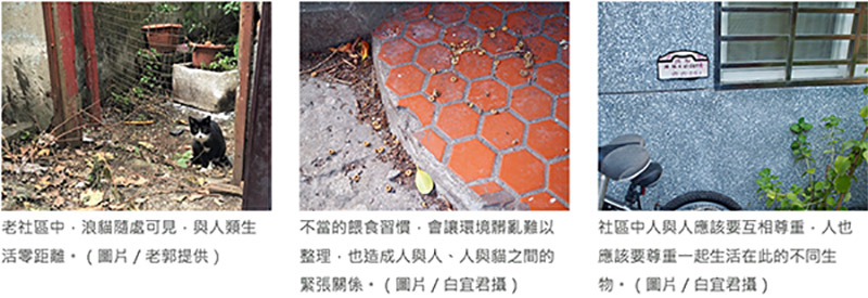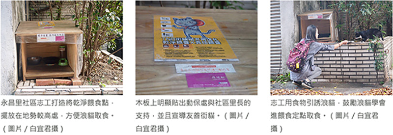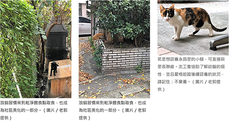 在臺北市汀州路與和中華路之間的永昌里,是一個寧靜的老社區。巷弄窄小、三、四層樓的老公寓參差比鄰,騎樓下多是做生意的店面,住戶多半長久為鄰,彼此相識。「這裡矮房子多,浪貓也很常見。」在社區住了30多年的劉媽(化名),家裡養了3隻貓、3隻狗,是社區資深愛媽,也是資深鄰居。她說自己是低調餵食浪貓浪狗的「個體戶」,長期以來不時被鄰居抗議,「造成環境髒亂」是主要投訴理由。劉媽體諒地說,「有些人住在一樓,會覺得困擾。」而在今年初,在一群社區志工協力下,永昌里自發性蓋起4個木製貓屋,推動定點「乾淨餵食x 責任餵養」,讓街貓與人類的生活往和諧共處邁進。