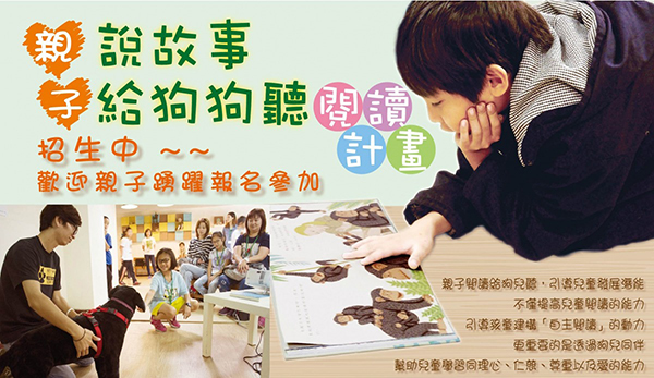 在歐美各圖書館、學校、或動物收容中心用於推動幫助兒童、青少年閱讀施行已久的教育方案「Read to dog」,現在在台灣也有!台灣動物平權促進會(簡稱動平會)舉辦「親子說故事給狗狗聽閱讀計畫」,邀請家庭一起來參加,透過5週的課程,一起認識同伴動物、展演動物與棲地動物,建構兒童自主閱讀的動力,並透過同伴動物的陪伴,激發他們對動物的同理心及愛的能力。