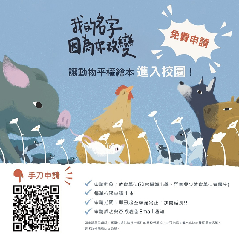 - 申請方式:填寫表單「免費繪本及推廣講座申請--《我的名字 因為你改變》|動物平權繪本推廣計畫」