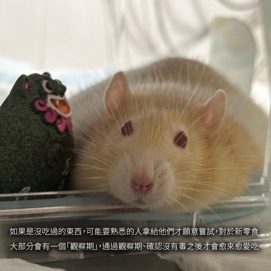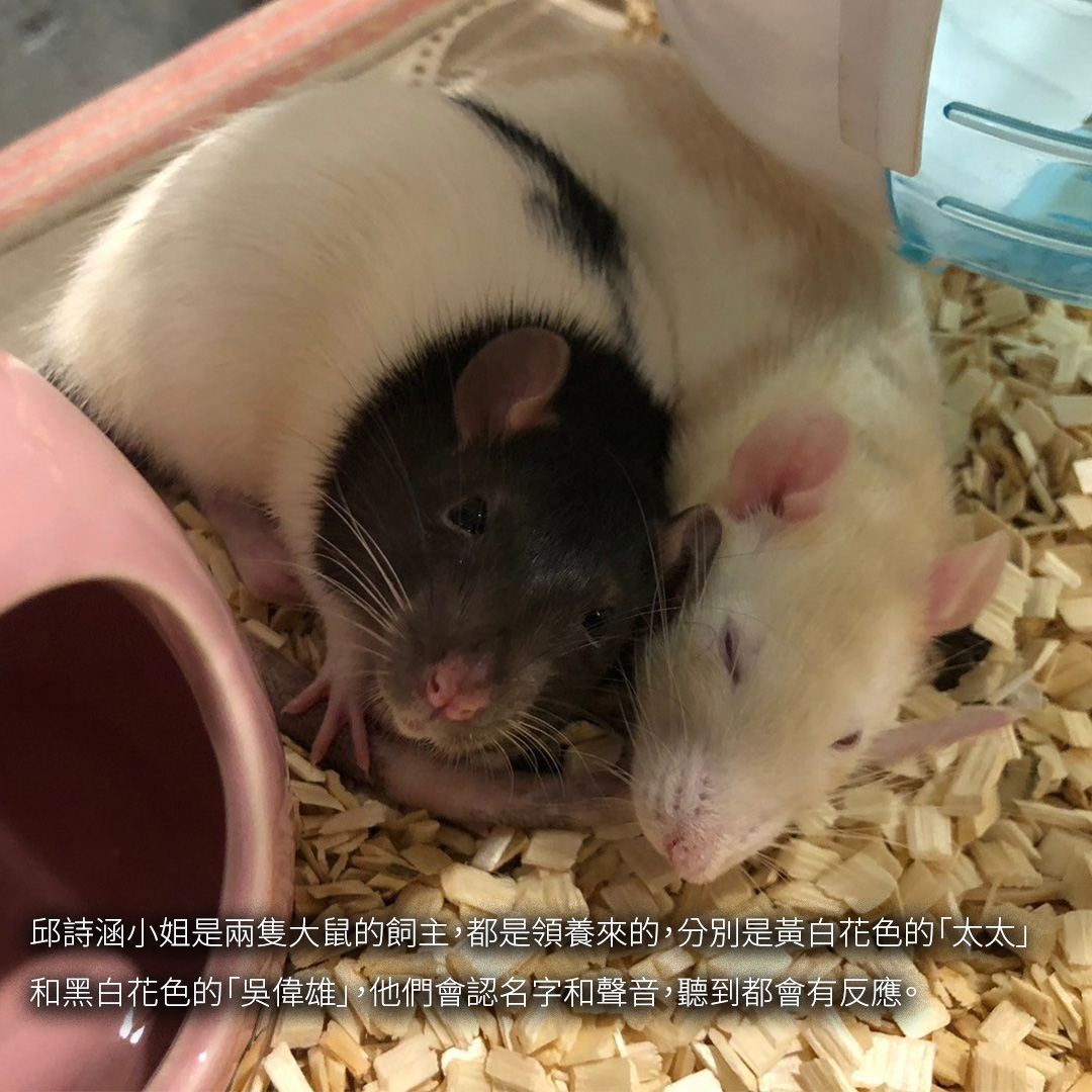 邱詩涵小姐是兩隻大鼠的飼主,都是領養來的,分別是「太太」和「吳偉雄」,他們會認名字和聲音,聽到都會有反應。而且從她養的老鼠發現,他們聰明又膽小,以「吃」方面為例,他們偏愛吃熟悉的東西,如果是沒吃過的東西,可能要熟悉的人拿給他們才願意嘗試,對於新零食大部分會有一個「觀察期」,通過觀察期、確認沒有毒之後才會愈來愈愛吃。