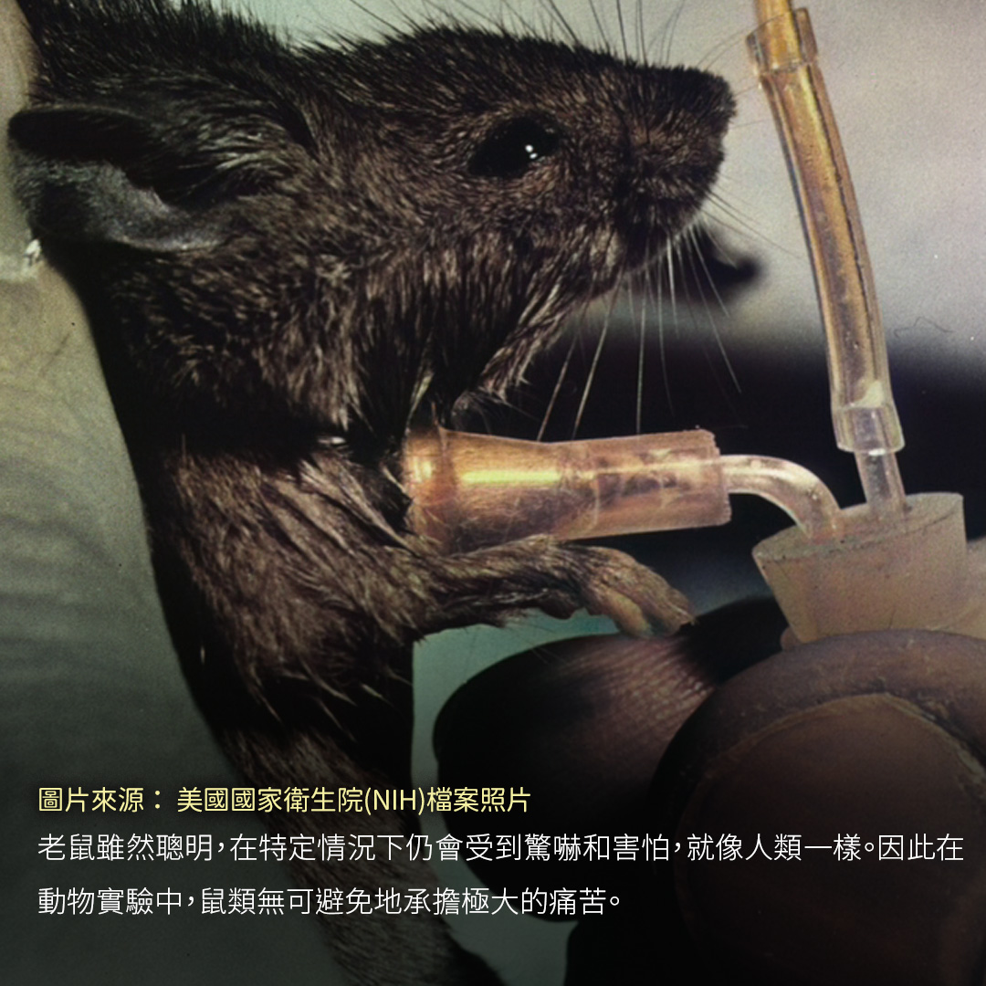 老鼠雖然聰明,在特定情況下仍會受到驚嚇和害怕,就像人類一樣。因此在動物實驗中,鼠類無可避免地承擔極大的痛苦。張勝鬘指出,動物實驗殘忍超乎想像,而大小鼠就是最常被拿來做實驗的動物之一。