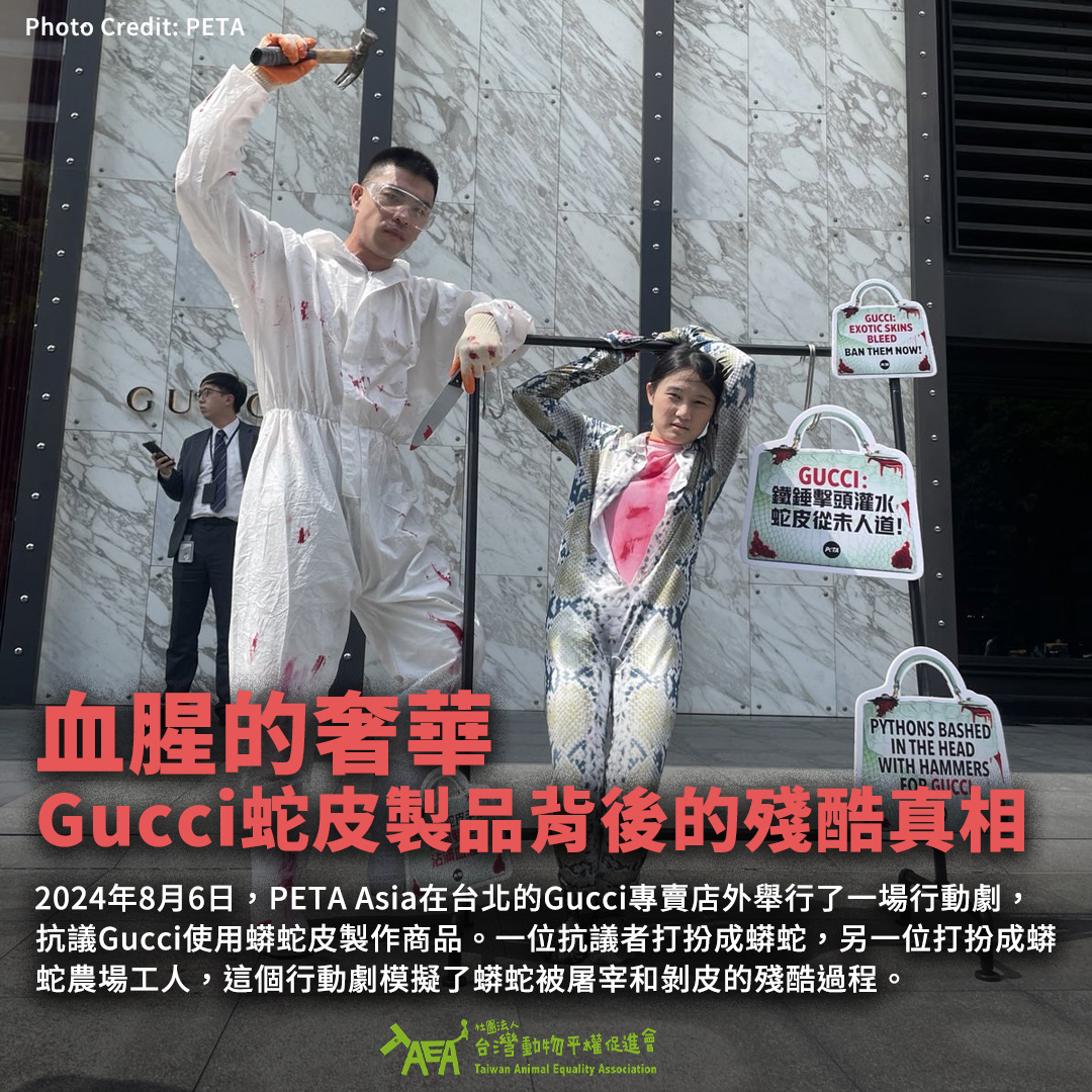 2024年8月6日,PETA Asia在台北的Gucci專賣店外舉行了一場行動劇,抗議Gucci使用蟒蛇皮製作商品。一位抗議者打扮成蟒蛇,另一位打扮成蟒蛇農場工人,這個行動劇模擬了蟒蛇被屠宰和剝皮的殘酷過程。