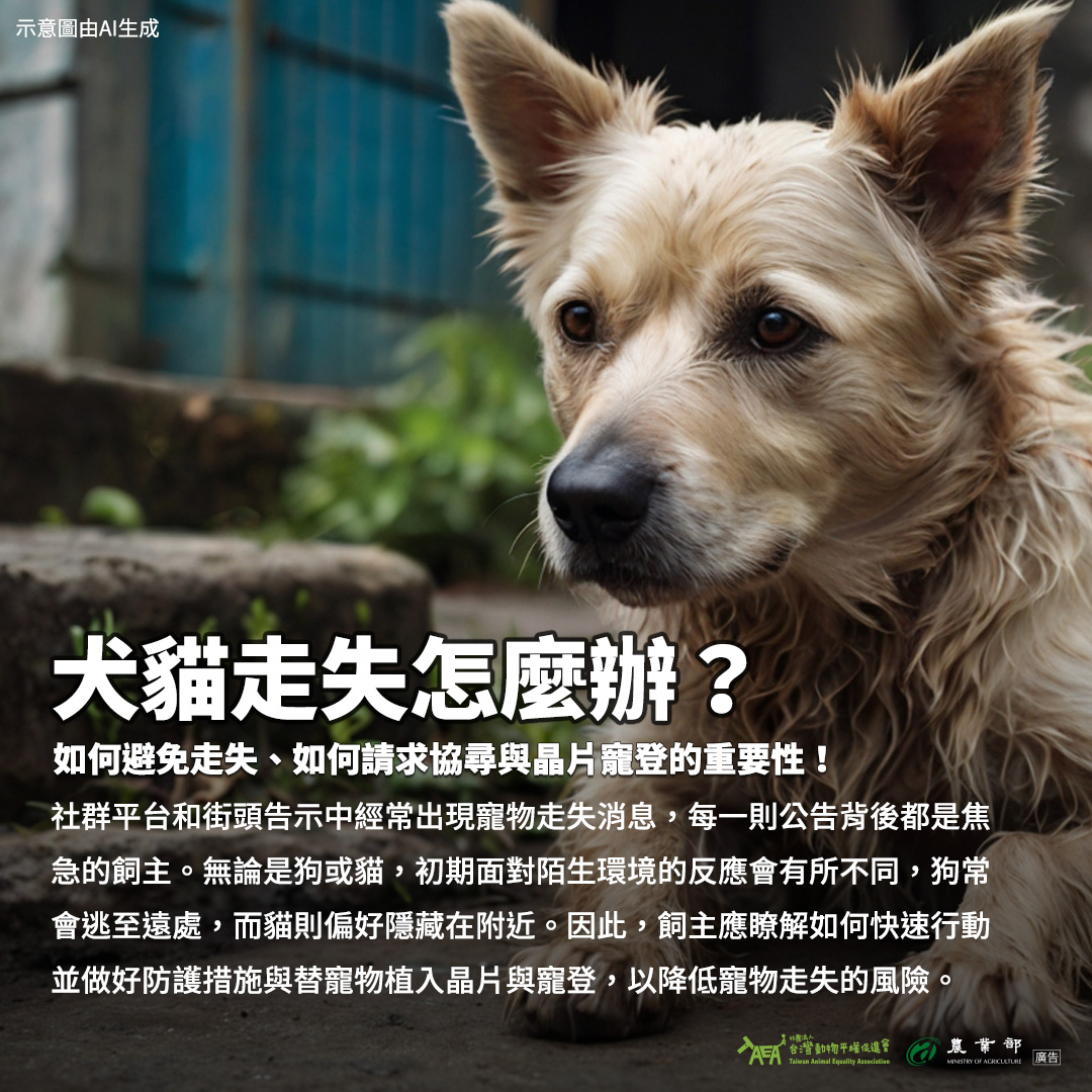 社群平台和街頭告示中經常出現寵物走失消息,每一則公告背後都是焦急的飼主。無論是狗或貓,初期面對陌生環境的反應會有所不同,狗常會逃至遠處,而貓則偏好隱藏在附近。因此,飼主應瞭解如何快速行動並做好防護措施與替寵物植入晶片與寵登,以降低寵物走失的風險。